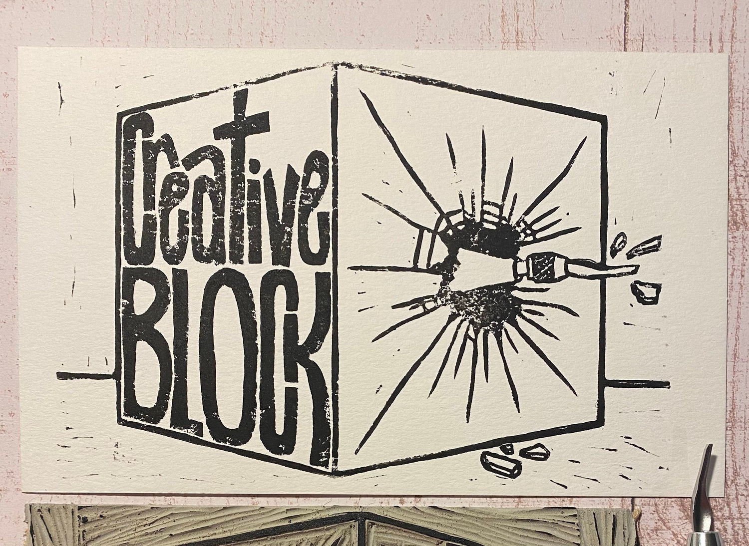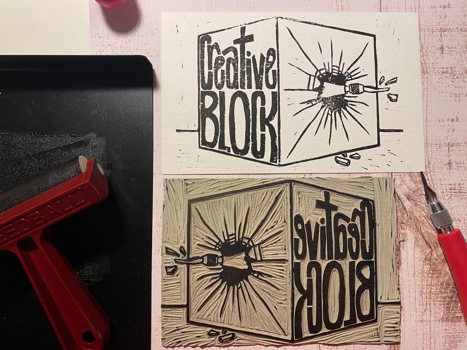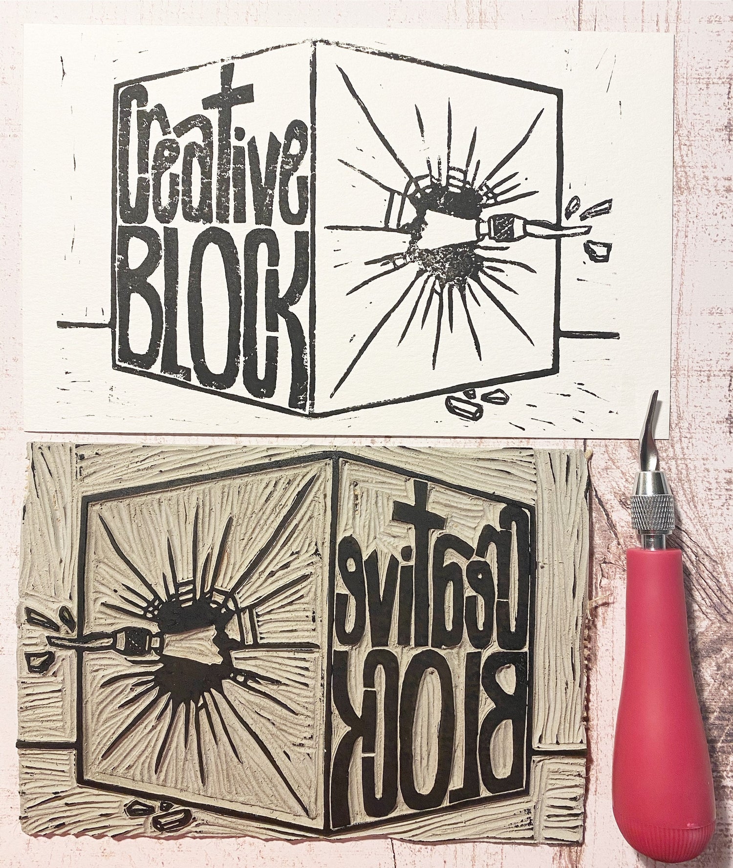 I created this block in response to a “Creative Block” prompt from @PrinterSolstice on Instagram. I’m grateful that they have gotten me out of my own creative block! Because of these prompts I have been prolifically printing and making new work...and of course coming up with more and more ideas with each new design and print. I just kept picturing a glass box shattering with big graphic letters and my first carving tool punching through. Pandemic has been hard on all of us, and my art was completely affected. I came to a standstill. After watching “Blown Away” on Netflix and happening across the Printer Solstice prompts, that was that! Now I literally RUN to my studio as soon as my toddler falls asleep. I always want to be in there! Happy creating fellow artists!