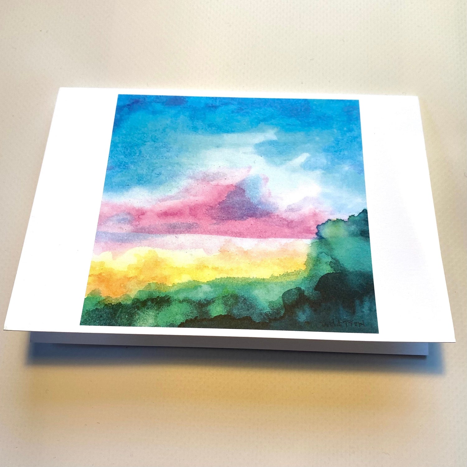“Bright Day, Pink Cloud” is one of my favorite color studies. The original was watercolors on an aqua board and I loved it so much it became part of my logo. It was inspired by photos I’ve taken of sunrises and sunsets over water around the Northeast of the United States - all those hyper colors. And those bright pink clouds still managing to surprise me every time.