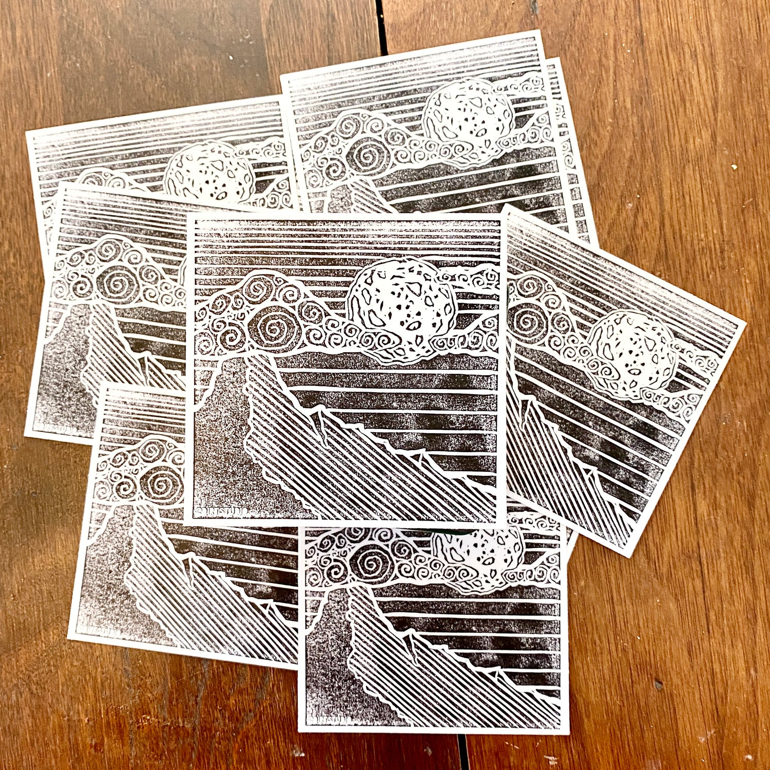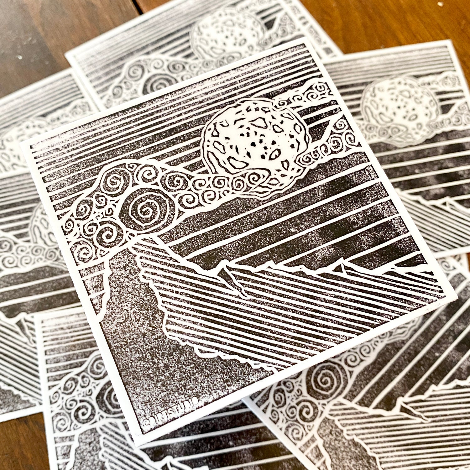 “Varied Moon” was hand-carved from a rubber block for the #CarveDecember hashtag on Instagram and now it’s an awesome sticker! The prompts were “moon,” “varied,” and “alone” for days 5, 6, and 7. This feels like it very logically came to my mind, although I realize as an artist that this “method” must work differently for every single person on the planet. Which alone, is just a cool thing to think about. Every piece of art you come across is the product of so many different things - it can blow your mind if you try to think it all through!