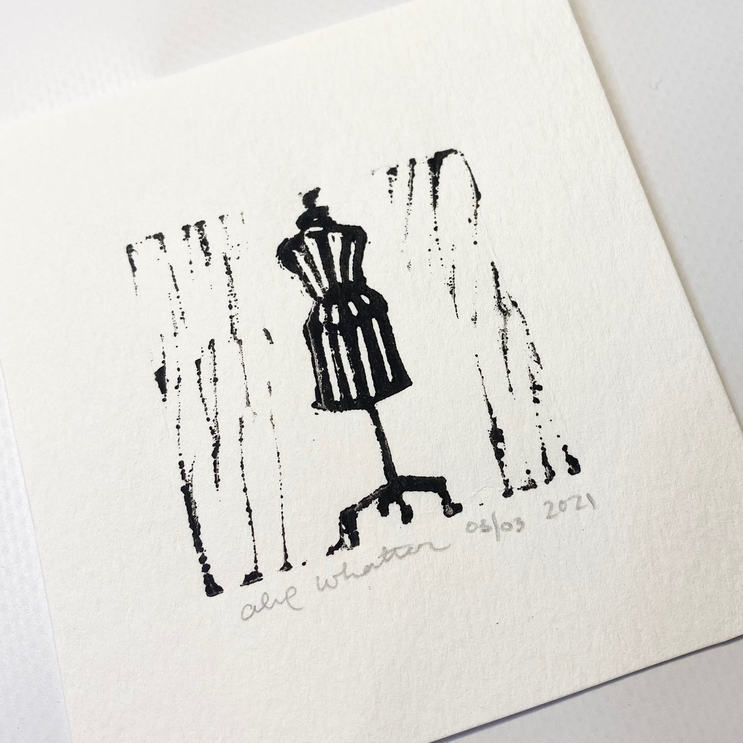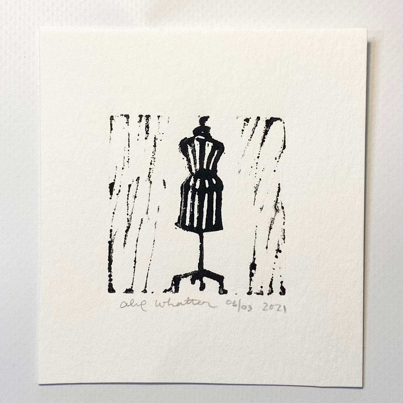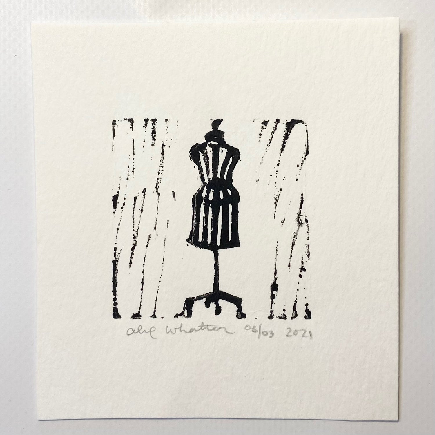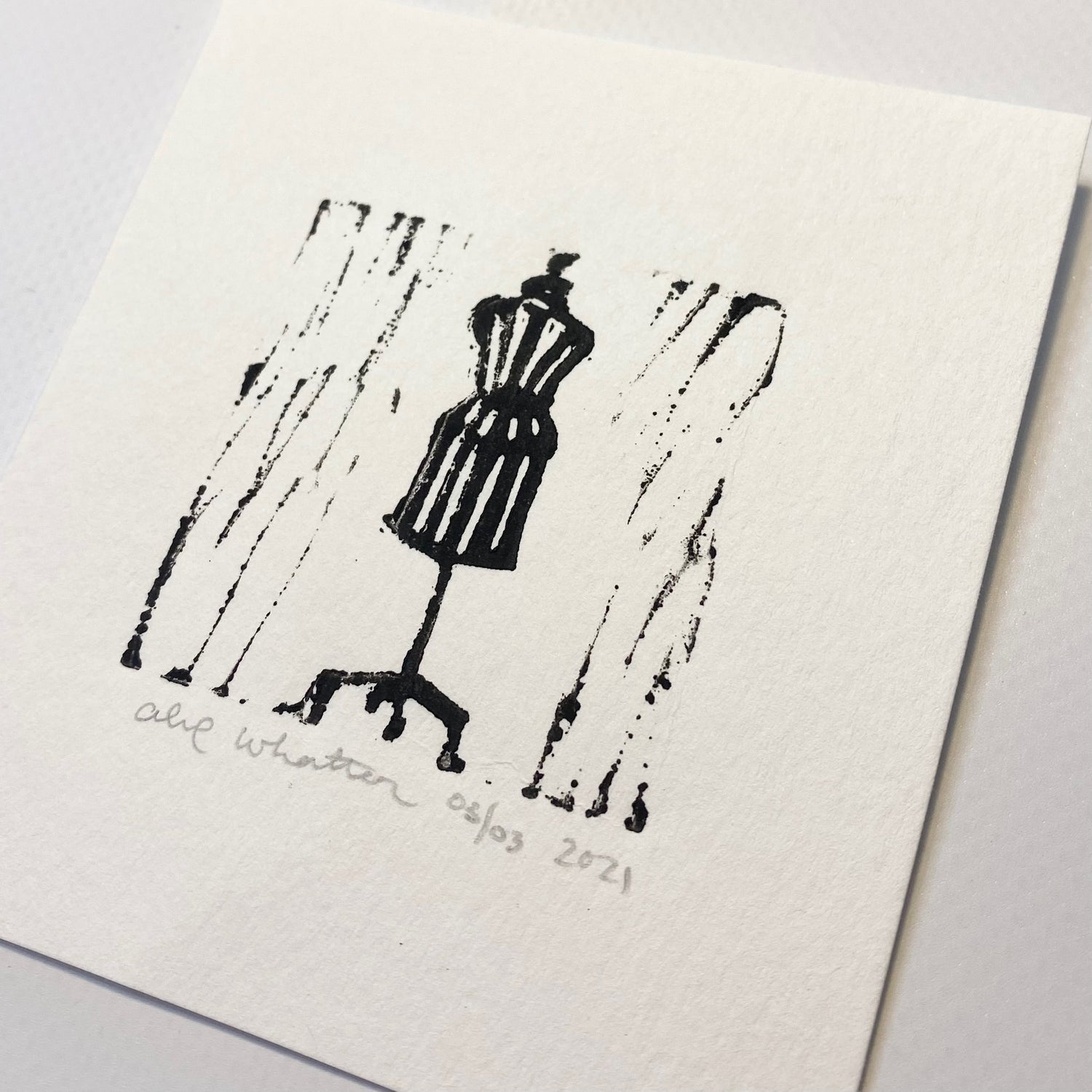 A mini linoleum block I carved with a dressform. I have a degree in Fashion Design from Parsons and used to nearly live amongst dress forms! I have one in my studio and they always find their way in to my other art forms, as well.