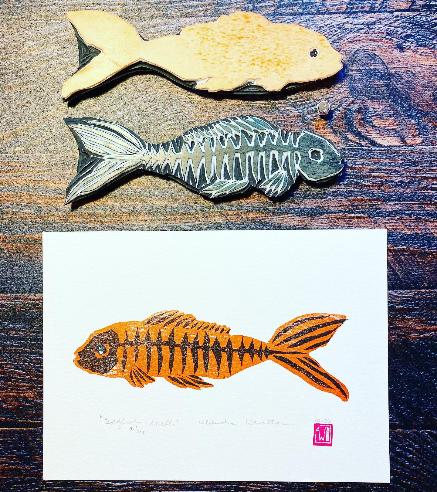 Here is the "dressed" fish skeleton relief print. These are so much fun to carve. They have their own personalities. How can a skeleton feel joyful? It’s like it is smirking.