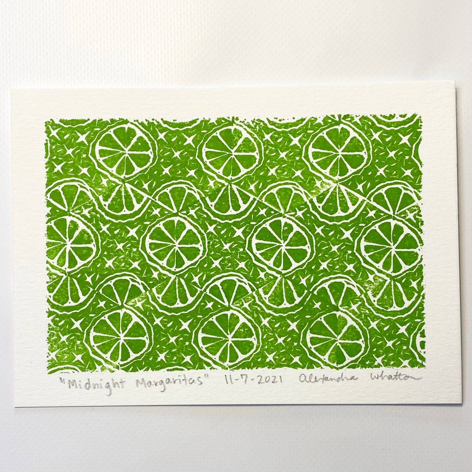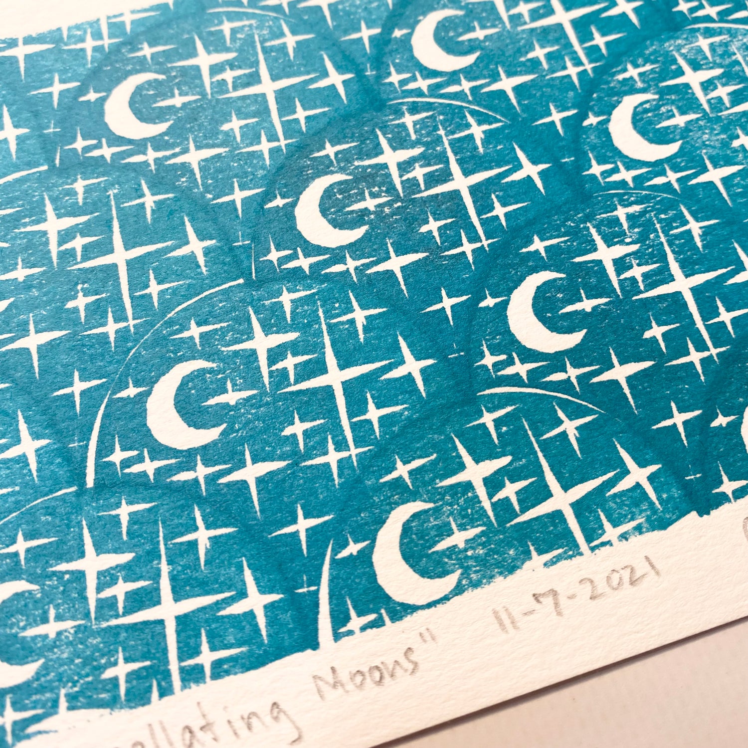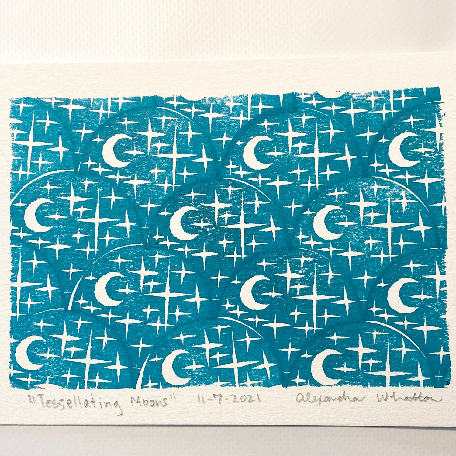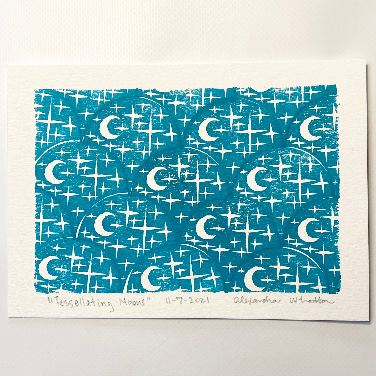 These 5x7" prints are made using one hand-carved block in a repeating pattern called a tessellation. (I explain this a little bit more of my Process page.) So after I carved and tested my block, I attempted many different repeating patterns. These repeated feel calming but intriguing. I am fascinated by tessellations.