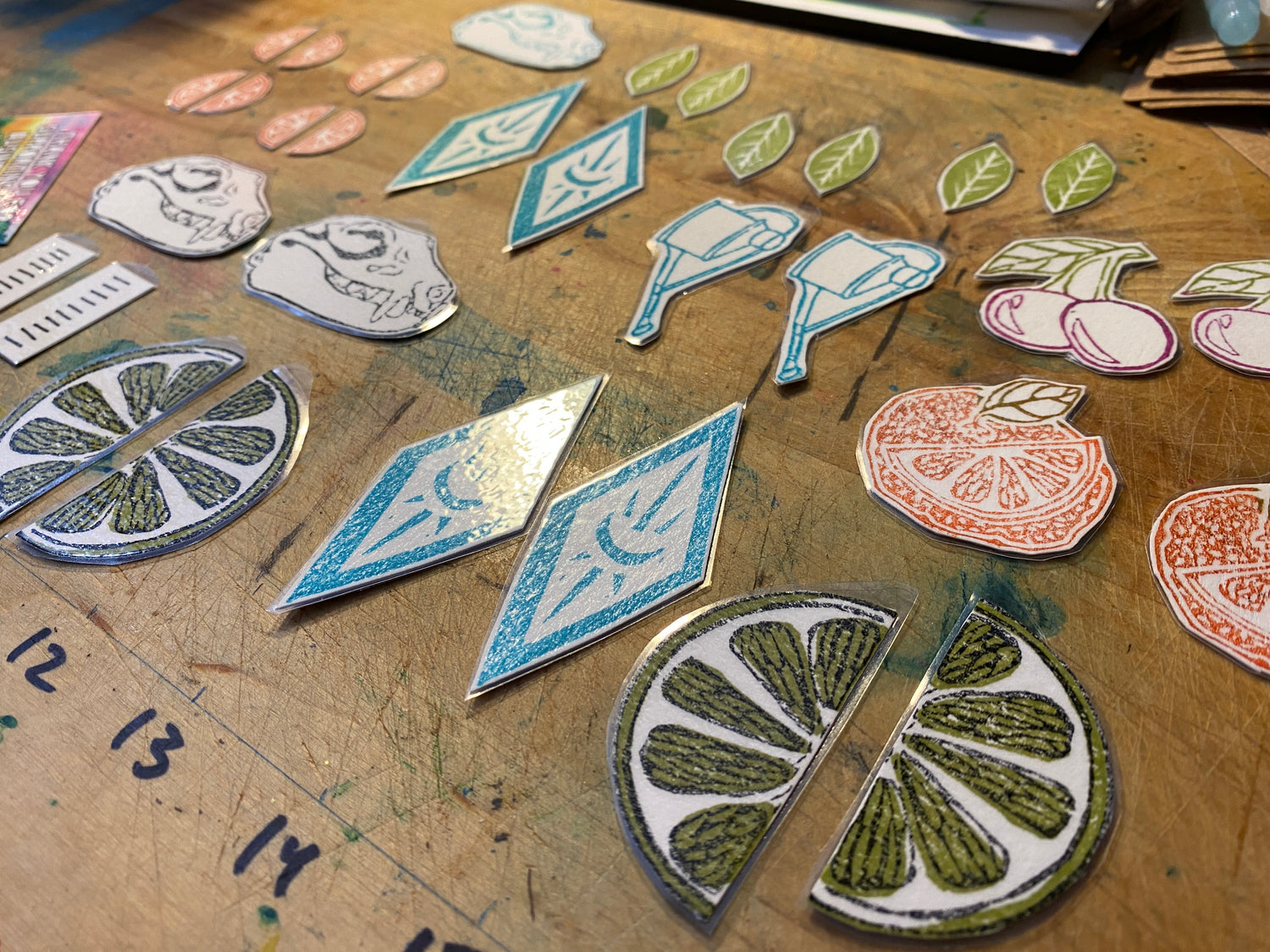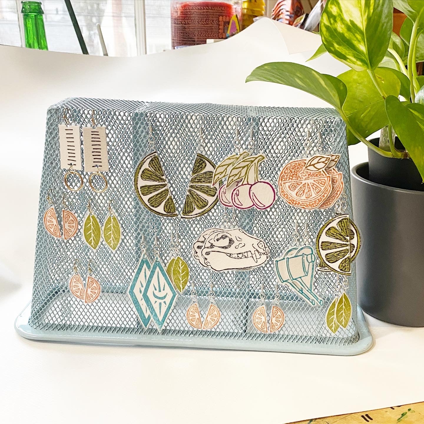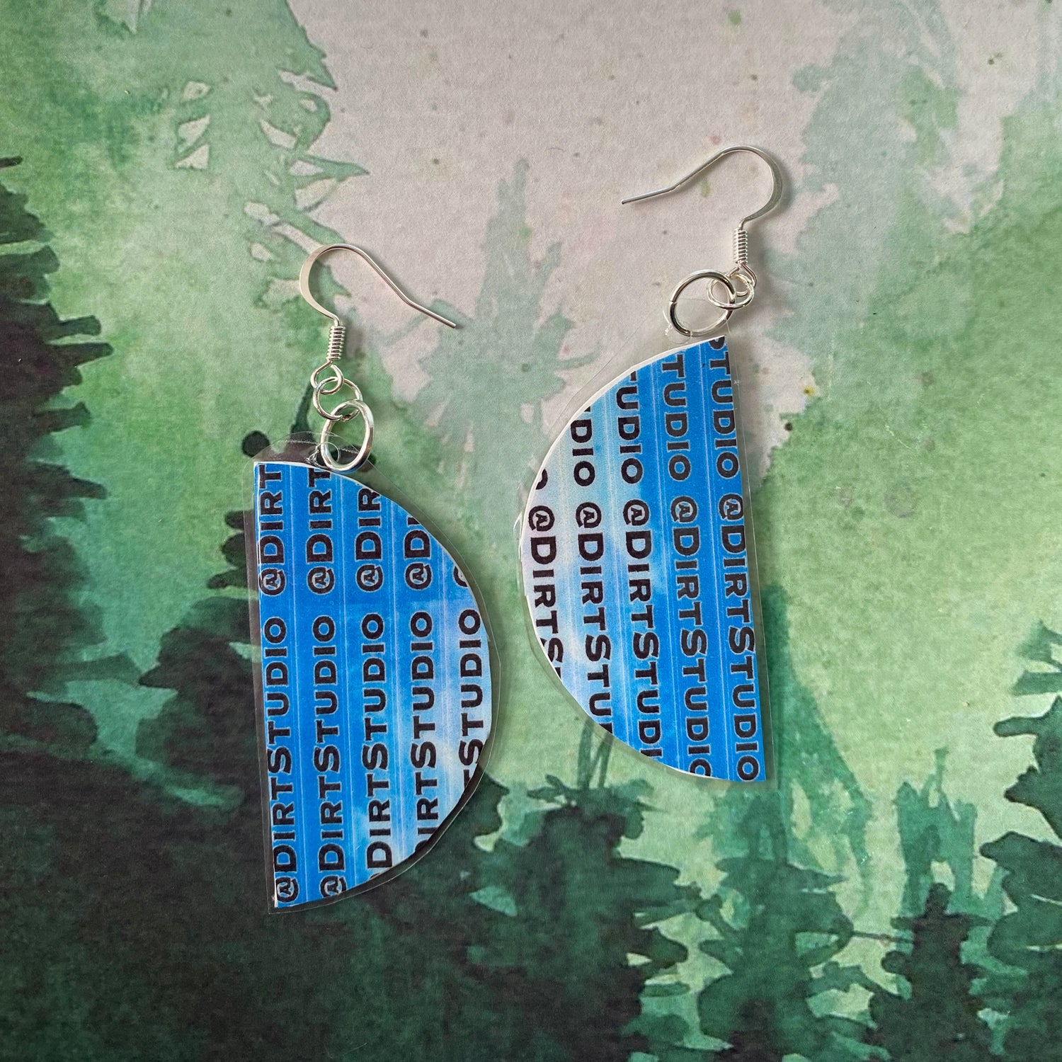 These earrings were made by me! I hand-carved two rubber stamps, then hand-stamped the earrings in two colored layers, before laminating and adding the jewelry findings! You can only get these from Dirt Studio LLC!