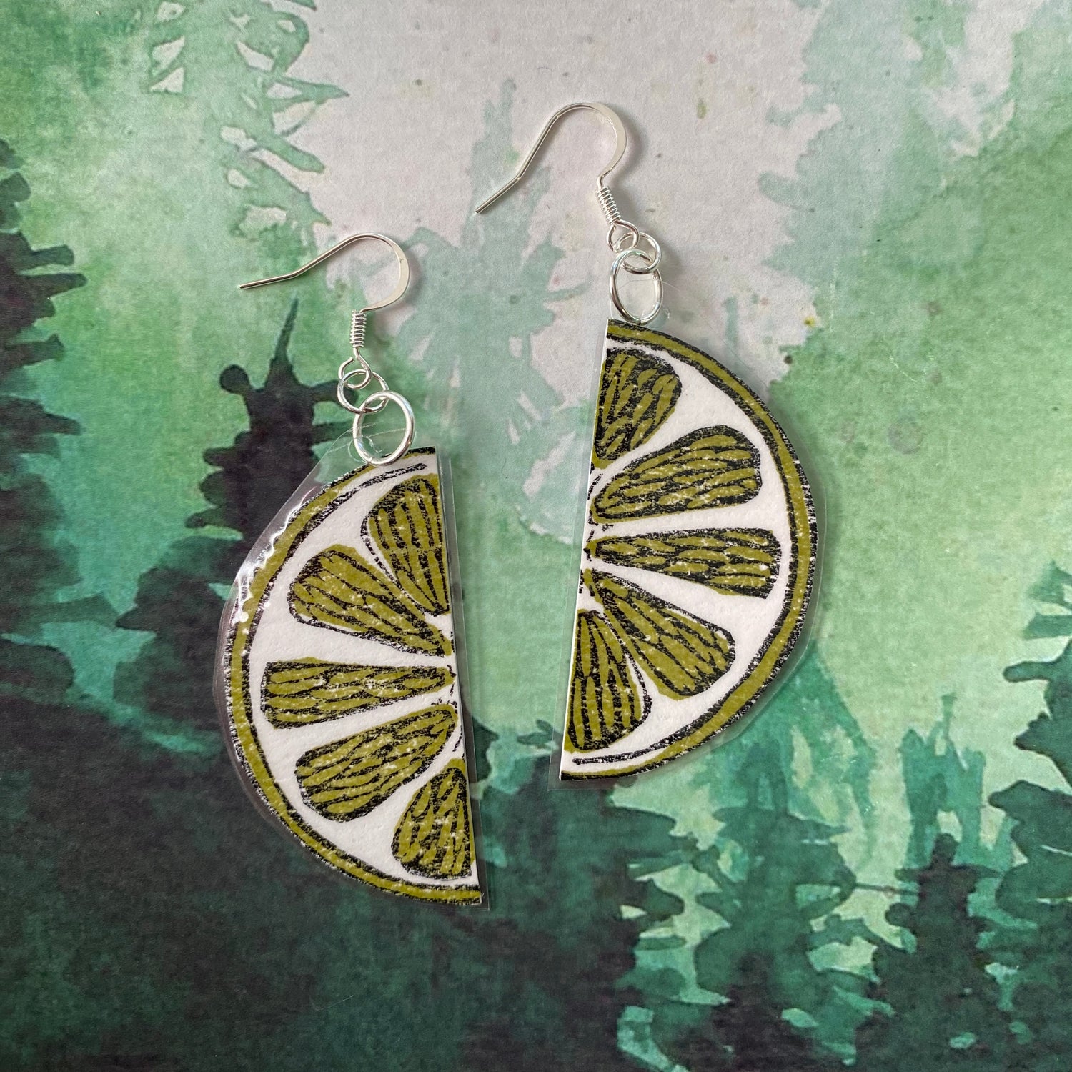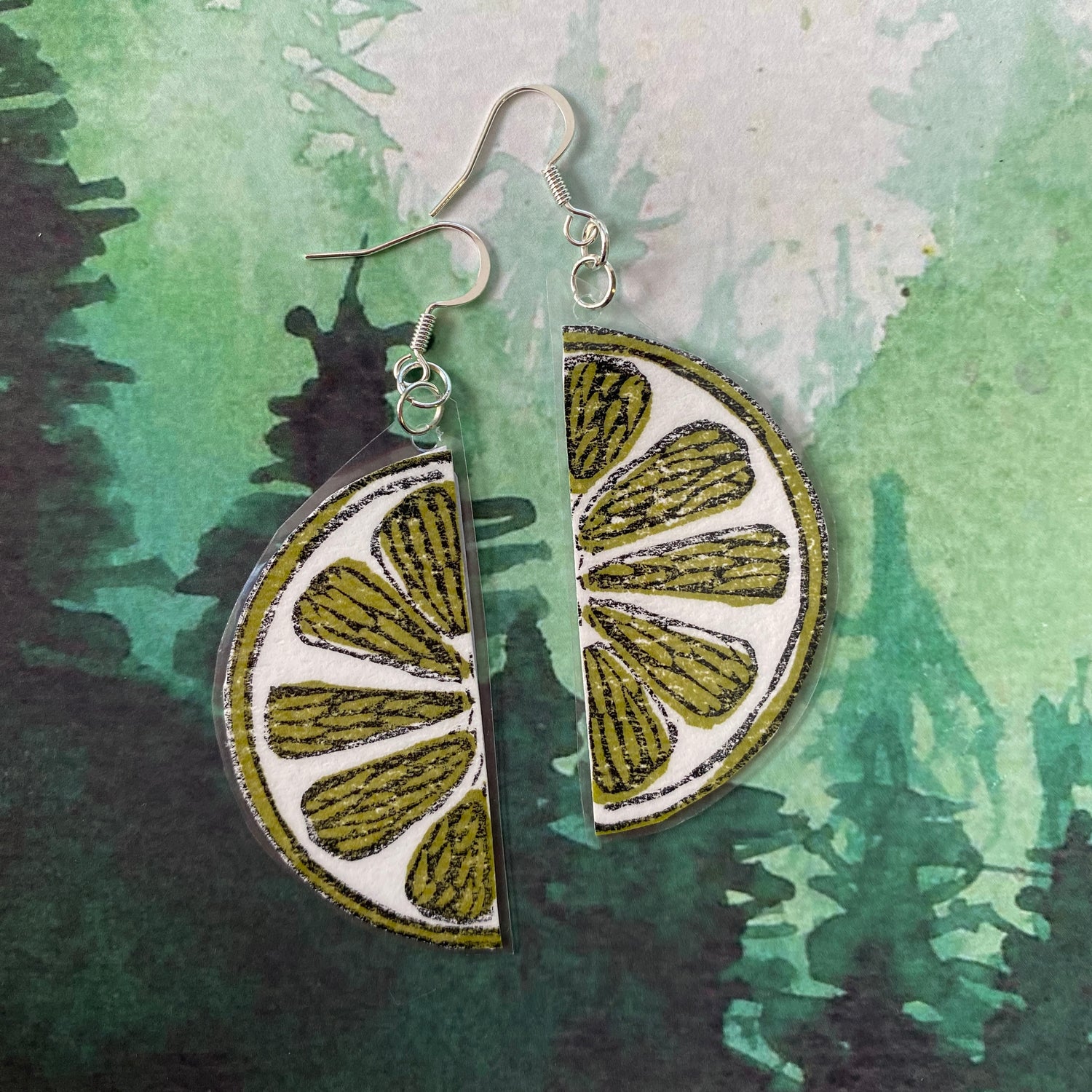 Lime Slice earrings! Made with silver-colored, nickel-free metals. They have about a 3” drop