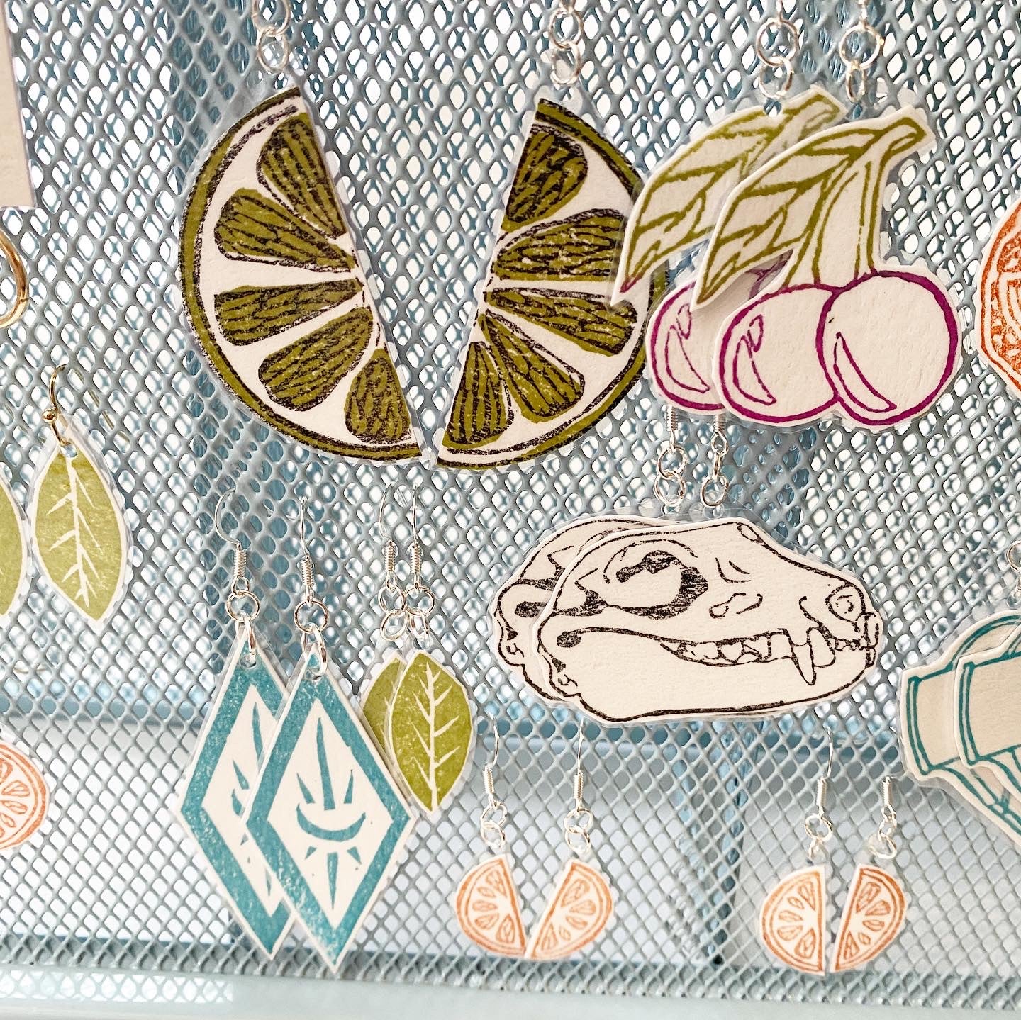 These earrings were made by me! I hand-carved the rubber stamp, then hand-stamped the earrings in two colors, before laminating and adding the jewelry findings! You can only get these from Dirt Studio LLC!
