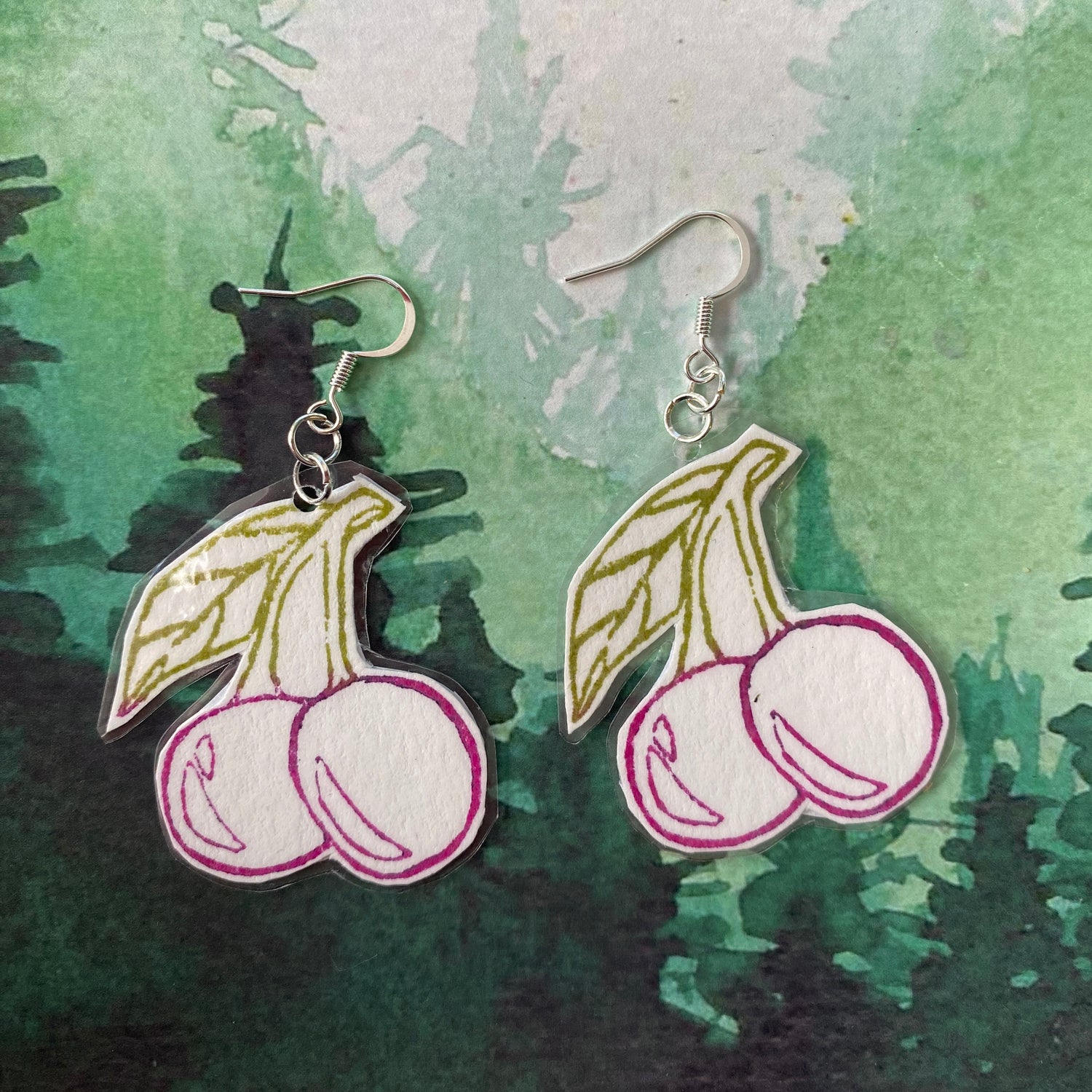 Lucky Cherry earrings! Made with silver-colored, nickel-free metals. They have about a 2.5” drop