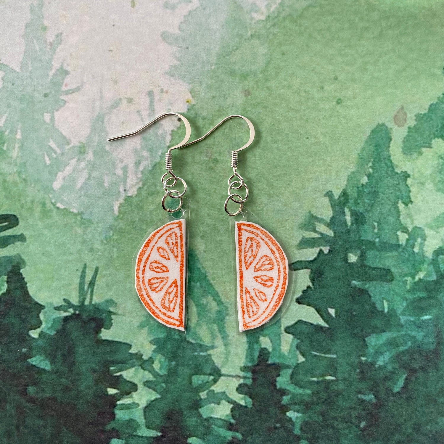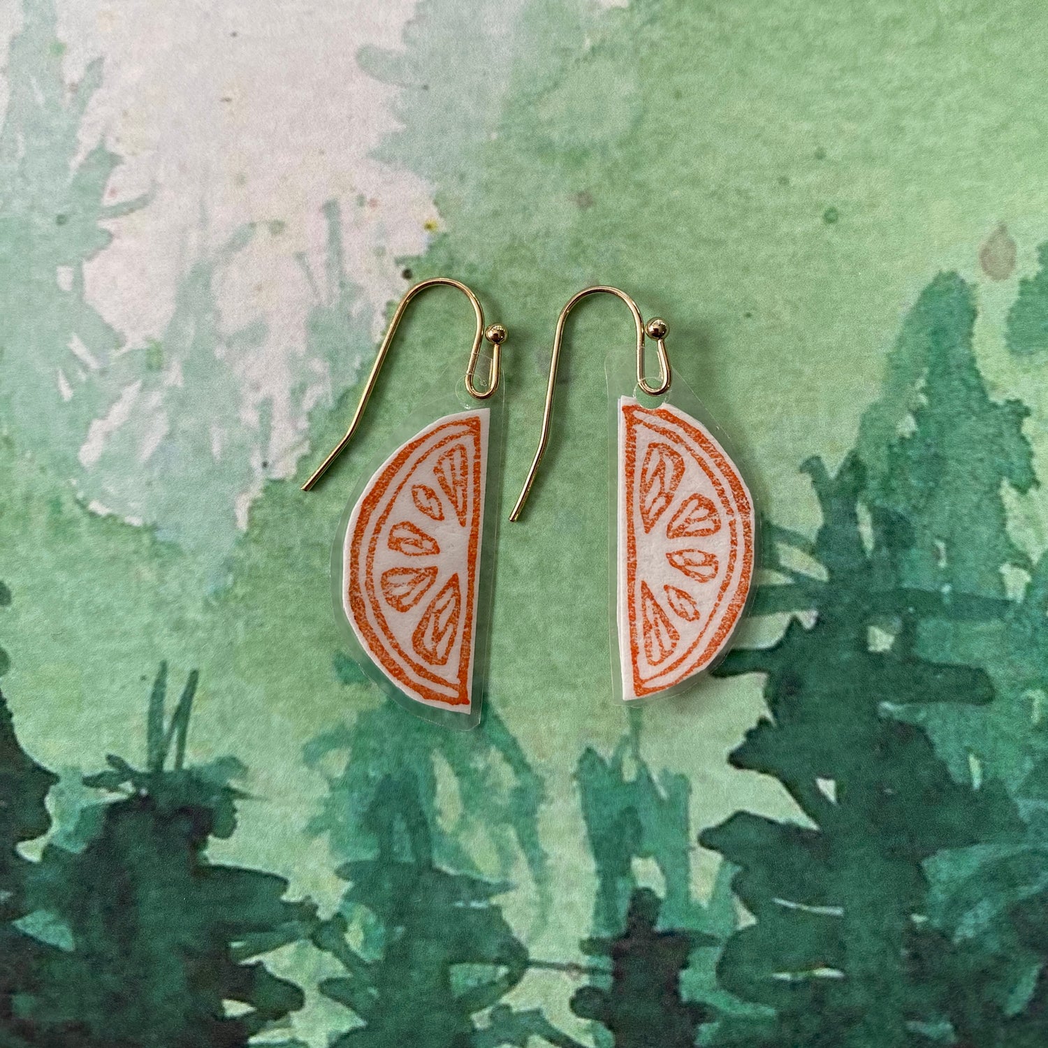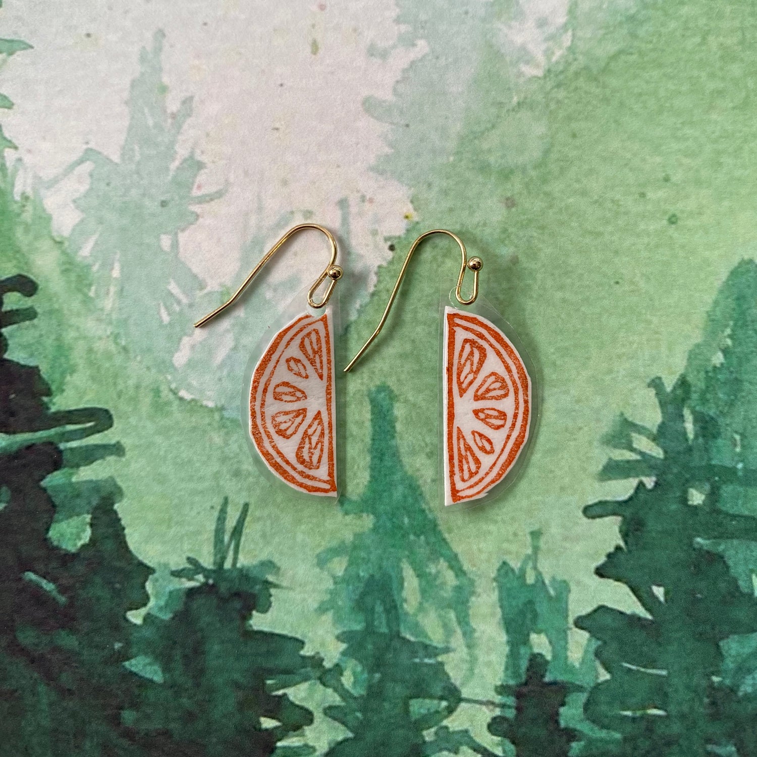 Tiny Orange Slice earrings! Made with gold- or silver-colored, nickel-free metals. The gold-colored ones have about a 1.5” drop while the silver-colored ones are about 2”.