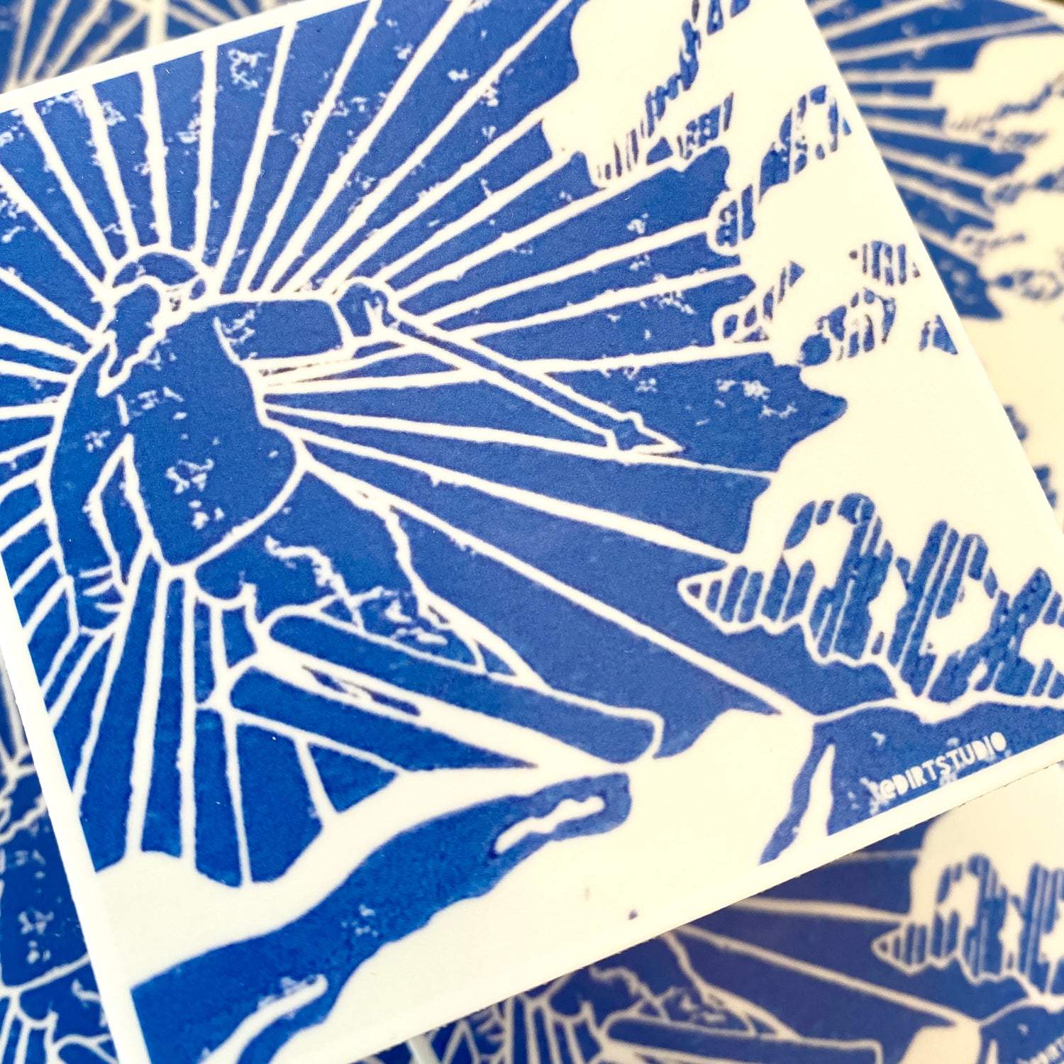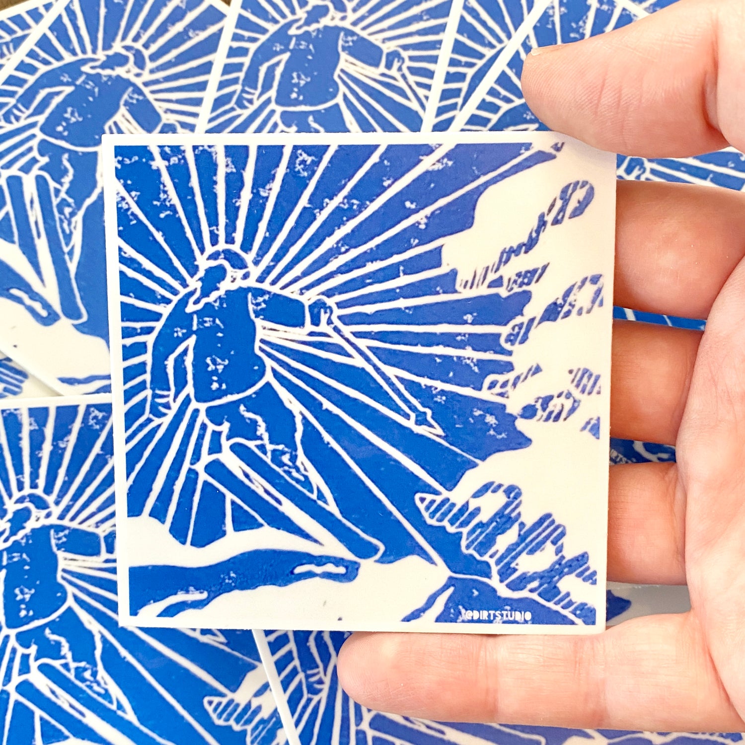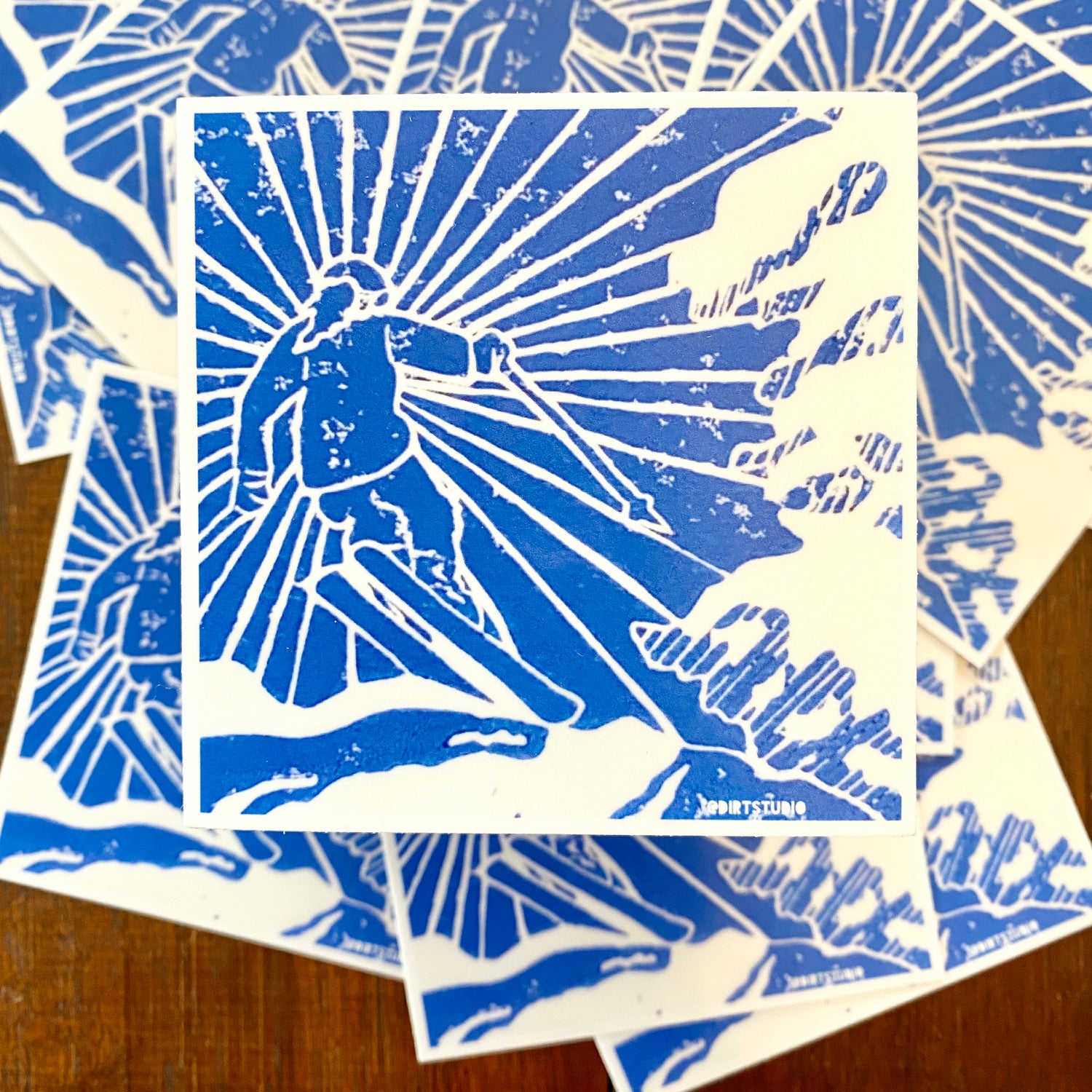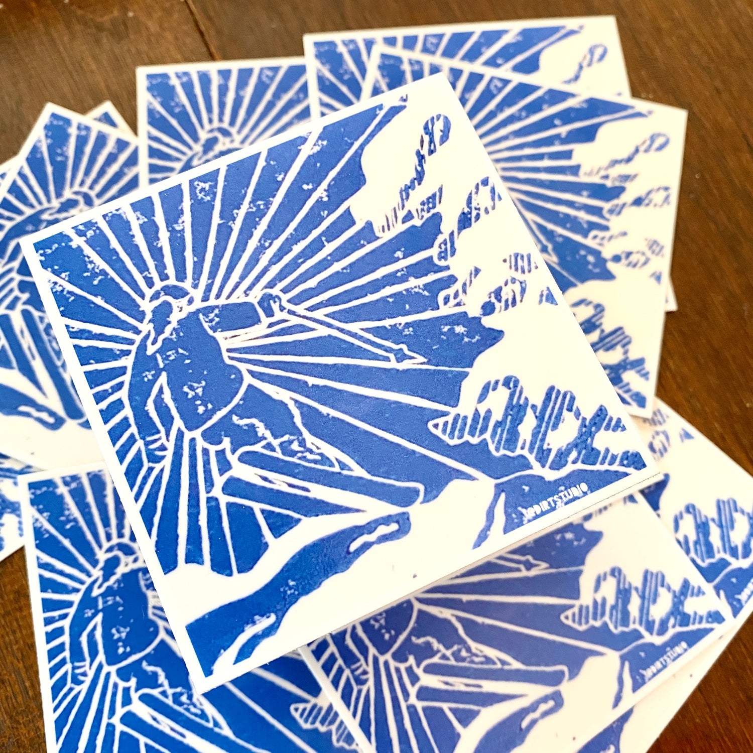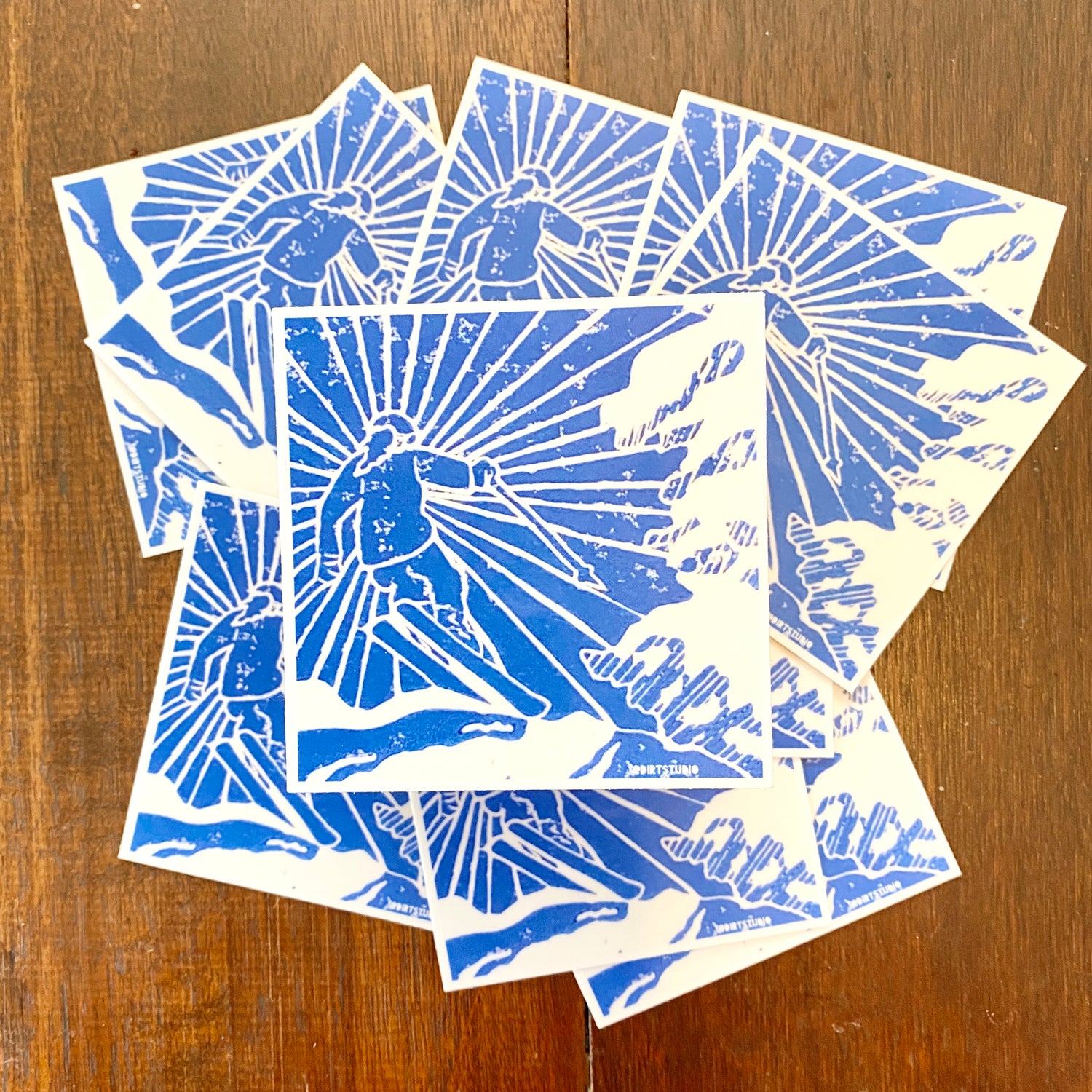 “Ski Jump 1st Run” is now a sticker! This is what I wish I were doing right now. I live in Connecticut and it is December 16th, 2021. We have had a flurry, but I want a giant snowstorm. And I want a blue jay day of skiing! The fresh powder, the sound of snow falling from the trees, and carving lines. I’m so stoked for this ski season! I had to print this in blue and then make a sticker. If you are a snow-lover, you probably know why, but if not, there is this certain light snow takes on where you can almost see every shade and tint and hue of blue in it. The shadows are deep and the sun is bright. It’s something no one could ever paint or photograph. It’s such a feeling!
